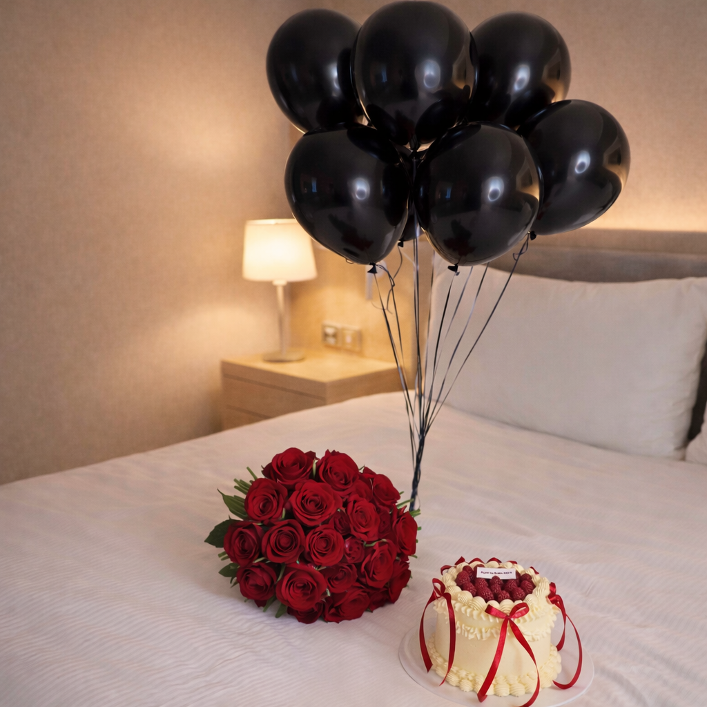 This arrangement features 20 fresh red roses beautifully styled, paired with 8 elegant black balloons for a modern touch, and a mini cake that completes the scene with charm and sophistication.