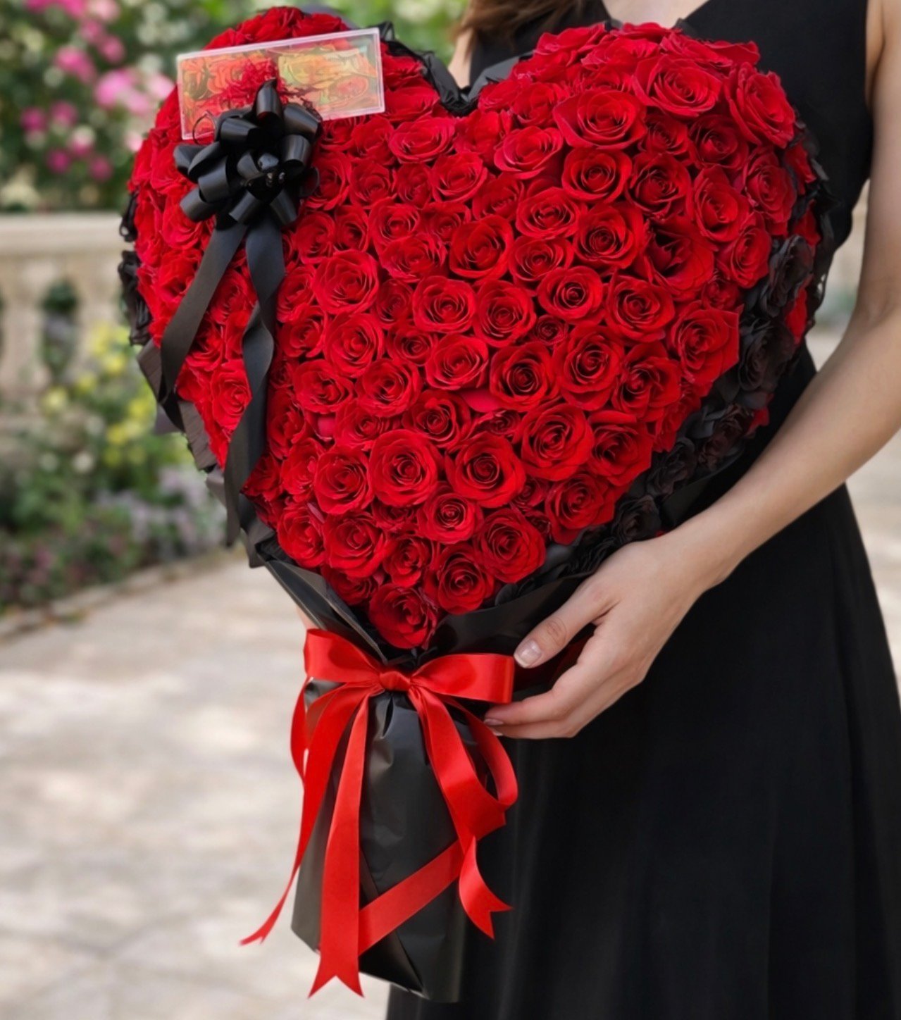 An elegant heart-shaped bouquet crafted with 100 fresh red roses, designed to express love in its most luxurious form.