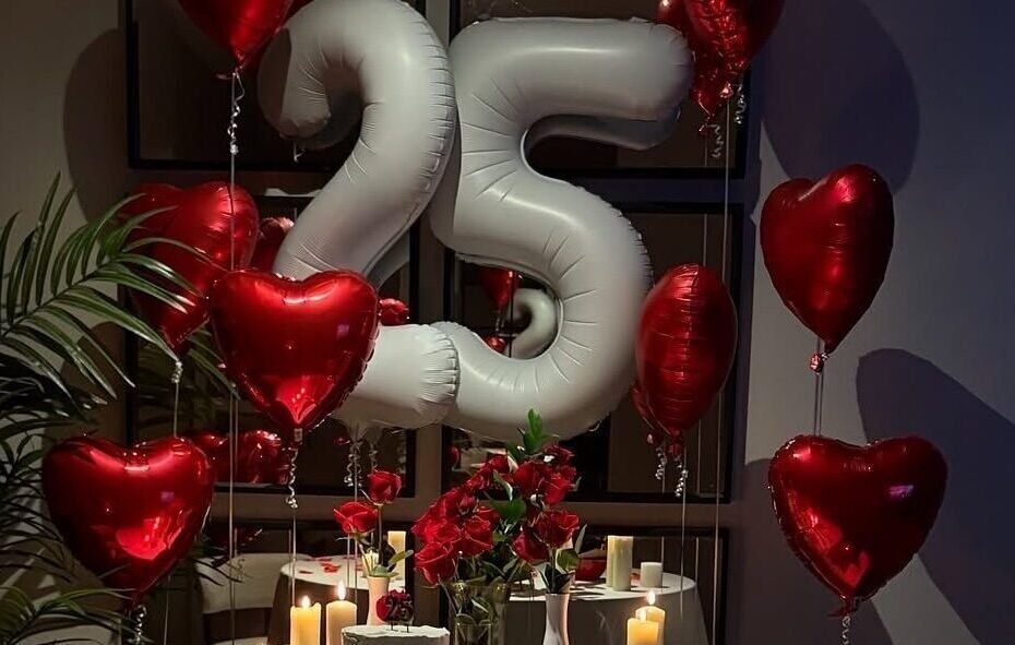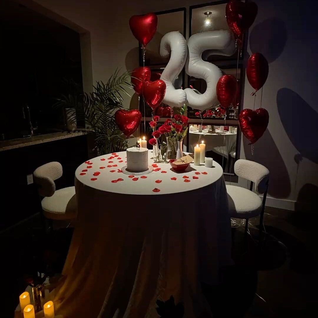 A romantic bedroom setup featuring helium number balloons, heart-shaped balloons, and a black rose box with red roses placed on the bed.