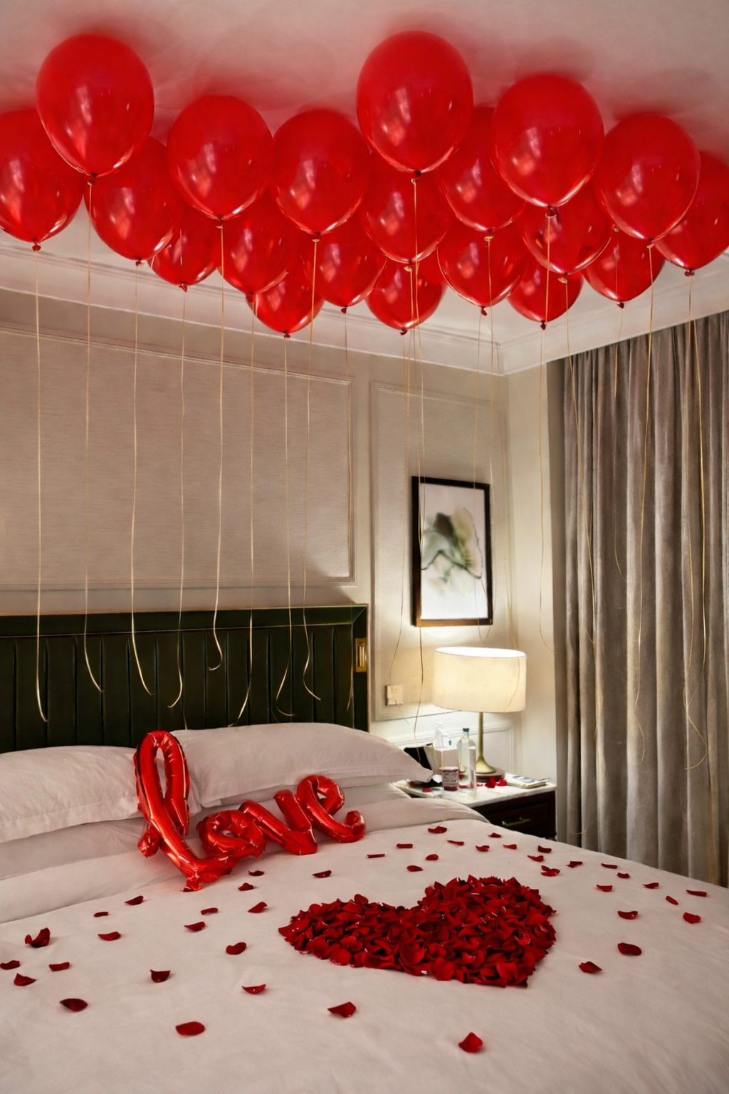 تنسيق بسيط لغرفة فندق رومانسي يضم 15 بالونًا أحمر مثبتة في السقف، وتشكيلة بتلات ورد على شكل قلب مع نثر بتلات ناعمة حولها، وبالون كلمة LOVE موضوع على السرير.