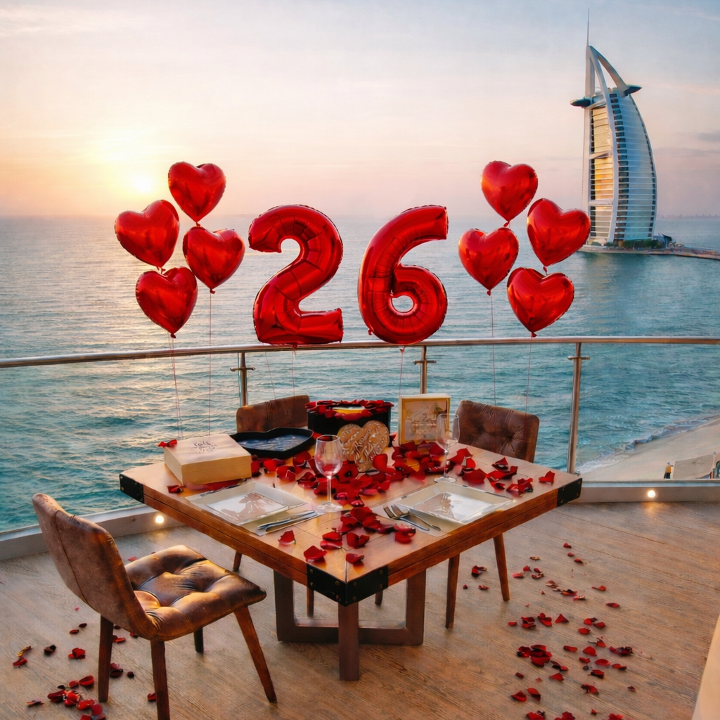 Table arrangement setup featuring 8 heart-shaped balloons, scattered rose petals on the table and floor, and a helium number balloon.