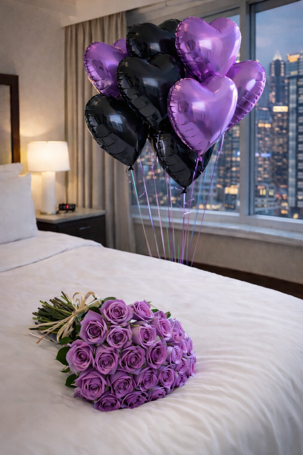 An elegant 20 purple roses with 10 a heart-shaped mix balloon purple and black